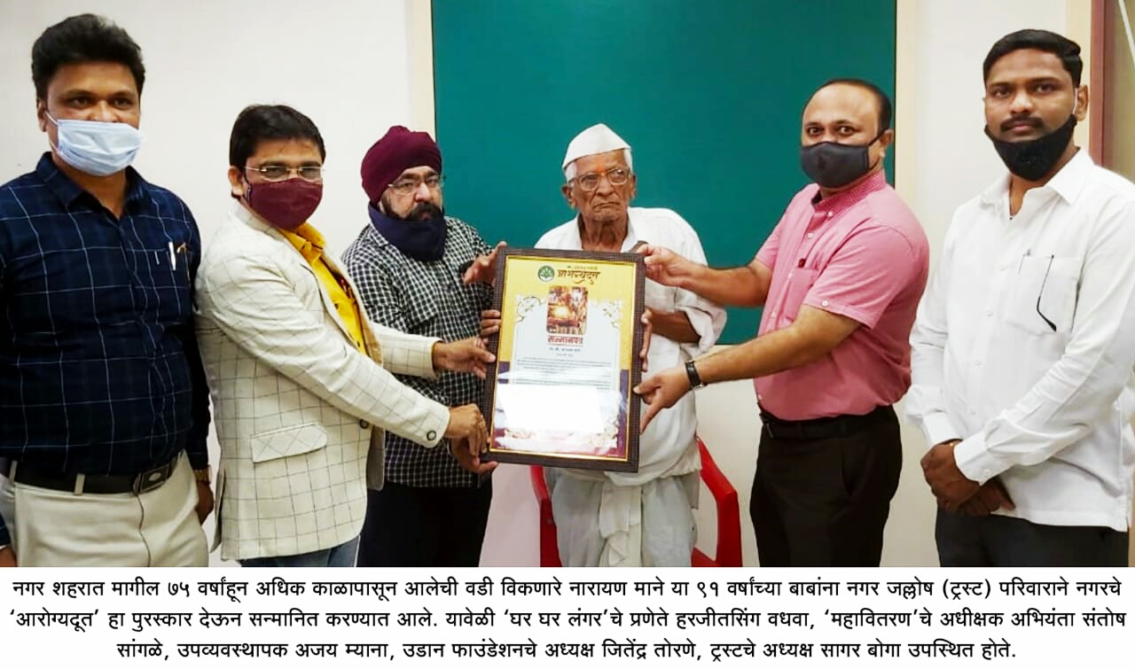 अ-नगर - नगर शहरात मागील 75 वर्षांहून अधिक काळापासून आलेची वडी विकणारे नारायण माने या 91 वर्षांच्या बाबांना, जे आजही नित्यनियमाने शहरातील विविध रस्त्यांवरून फिरून हाच व्यवसाय करतात त्यांना नगर जल्लोष (ट्रस्ट) परिवाराने नगरचे ‘आरोग्यदूत’ हा पुरस्कार देऊन सन्मानित केले.